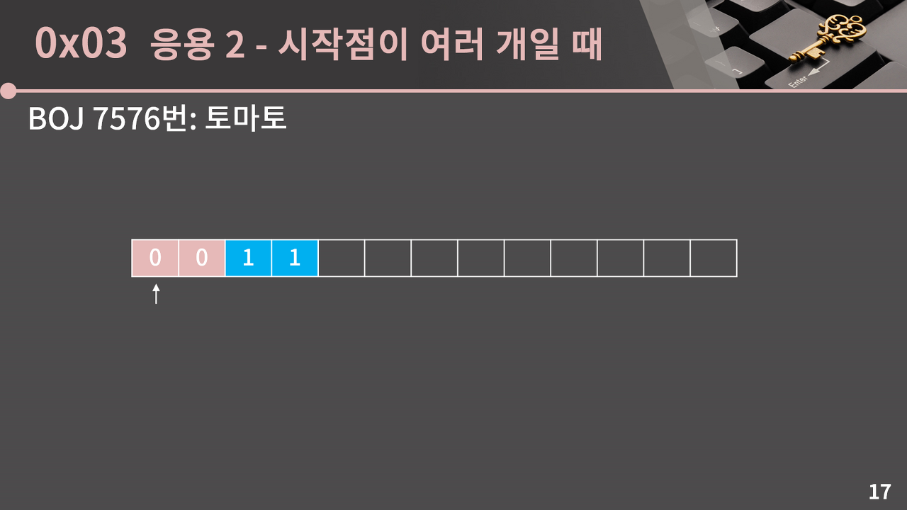 문제에서 예제 3번 같은 경우#include <iostream> #include <vector> #include <string> #include <algorithm> #include <queue> using namespace std; int board[1001][1001]; int dist[1001][1001]; int dir_x[] = { 0, 1, 0, -1 }; int dir_y[] = { 1, 0, -1, 0 }; int main() { int n, m; cin >> m >> n; queue<pair<int, int>> q; for (int i = 0; i < n; i++) { for (int j = 0; j < m; j++) { cin >> board[i][j]; // 익은 토마토의 위치를 큐에 넣기 if (board[i][j] == 1) q.push({ i,j }); // 익지 않은 토마토는 dist 배열에서 -1의 값을 가짐 // 익은 토마토와 빈칸은 dist 배열에서 0 if (board[i][j] == 0) dist[i][j] = -1; } } while (!q.empty()) { auto cur = q.front(); q.pop(); for (int i = 0; i < 4; i++) { int nx = cur.first + dir_x[i]; int ny = cur.second + dir_y[i]; if (nx < 0 || nx >= n || ny < 0 || ny >= m) continue; if (dist[nx][ny] >= 0) continue; dist[nx][ny] = dist[cur.first][cur.second] + 1; q.push({ nx, ny }); } // 루프 상태 확인용 /*for (int i = 0; i < n; i++) { for (int j = 0; j < m; j++) { cout << dist[i][j] << " "; } cout << "\n"; } cout << "------------------------"; cout << "\n";*/ } int ans = 0; for (int i = 0; i < n; i++) { for (int j = 0; j < m; j++) { if (dist[i][j] == -1) { // BFS를 다 돌았는데도 아직 안 익은 토마토가 있을 경우 cout << -1; return 0; } ans = max(ans, dist[i][j]); } } cout << ans; }+ 함께 알아두면 좋을 BFS의 특징